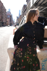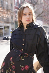 Its a black shirt that will double down as an over-shirt and will be your best friend this season. It fastens with coco shell buttons, and is made in cotton poplin.