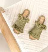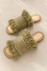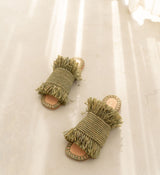 Bulibasha's iconic Bash fringed sandal in a gorgeous green designed using materials sourced locally in Indonesia. All-natural palm and coconut leaf fibers are handwoven using techniques exclusive to Bulibasha. Each pair takes up to four days to create, giving your shoes an individual stamp of creativity and artistic passion.