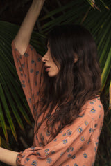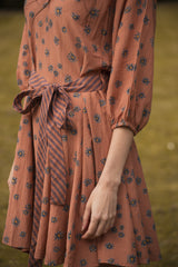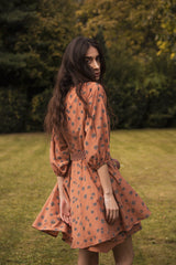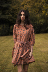The Cinnamon Daisy Print captures the enduring charm of daisies set against the warm and earthy backdrop of cinnamon. The print evokes a feeling of rustic elegance, with daisies artfully scattered across the fabric, creating a harmonious blend of natural beauty and design.This mini dress has godet style construction, it flows beautifully. It comes with a bias stripe detachable belt which can be used to cinched waist. For carefree afternoons that turn into fun evenings, this dress can be worn to any event. Pair with high boots and cozy scarf for this fall season.