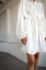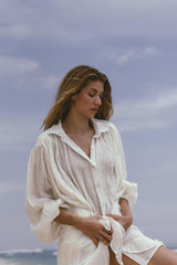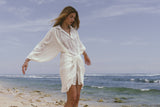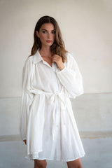 The crinkle shirt dress is our new bestselling silhouette. Crafted in an organic crinkle cotton, light and breezy for an effortless everyday go to look. For city or beach days the skirt creates a wrap around raw edged pareo that ties at the front to flatter every shape. Versatile and timeless.