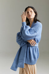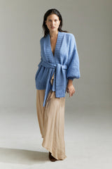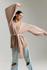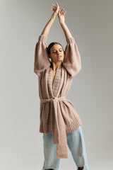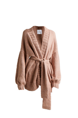 An iconic jersey knit cardigan boasting an oversized silhouette - luxuriously handcrafted in Peru with 100% Baby Alpaca - envelops the wearer in cozy comfort, cinched with an elegant tie.
