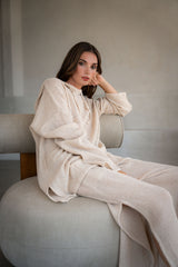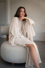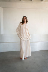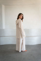 The Eddie Co-ord is crafted from organic crochet cotton. A relaxed fit with hooded sweater and wide cropped leg trousers. An instantly easy but pulled together look. An essential feel good combo for travel and leisure.