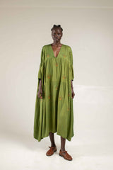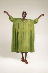 A season staple and a dress that can be worn to any occasion. The Maxi dress features a voluminous free size silhouette with tiered panels, a v neckline and 3/4 bell sleeves.