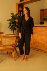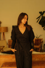 Our Forest wrap Top, a stylish yet easy-to-wear piece perfect for layering. The unique stitch detail on the sleeves adds a touch of volume and character, while the black hue gives it a warm, fall-ready vibe.
