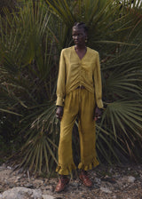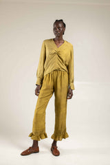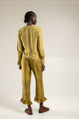 Made from botanically dyed handloom silk, the frill hem pants feature a straight leg cut with pin tuck details above the frill hem and an elasticated waist. Wear it with any of the matching silk tops to complete the look.