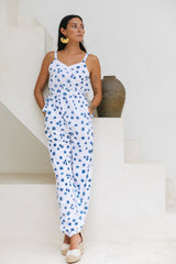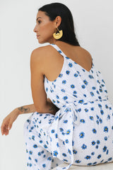 Printed with blue daisies on embroidered cotton, this is a dressy yet easy wear piece. It comes lined with The straps are broad, the neck line is a simple V with slight embroidery detail on it. It comes with a detachable belt. It has coconut button fastening at the ankle, if you'd like to style it differently