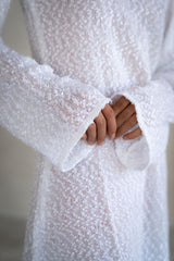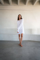 The Jagger mini is crafted from a uniquely textured, semi sheer knitted cotton. Evoking the feeling of summer, to be worn simply as a coverup or dress with a paidrof sandals or bare feet.