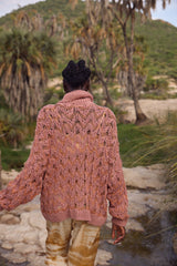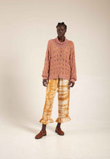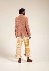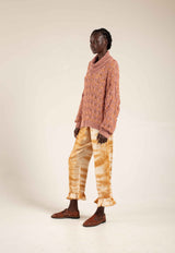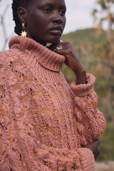 Hand knitted by local ladies on the foot hills of Mt.Kenya the Knitted Jersey features a wide long polo neck which can be worn rolled down or up. Made from two different yarns, one silk and one cotton giving the jersey its beautiful panelled features. Best styled over any of our tops and bottoms