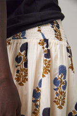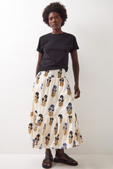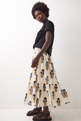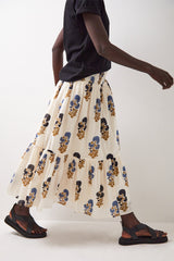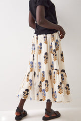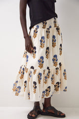 Our Lucy tiered midi skirt crafted from cotton. Floral motif pattern all over. Elasticated shirred waist for an easy fit. Skirt is fully lined.