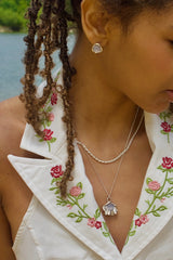The Melite earrings feature natural blue 8mm chalcedony cabochons, to represent calm waters of the ocean.