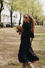 The Henrietta Dress is designed to take you effortlessly from day to night. With a contrasting neon cross stitch border and hand stitched detailing on the sleeves, this dress is the perfect combination of elegant and fun. Pair with sandals for lunch out with friends, or dress it up for evenings out.
