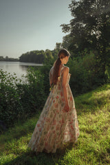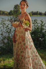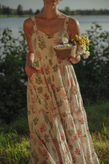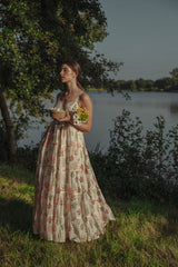 em & shi's signature tiered dress, oozes of volume and soft fabric. It is a full length dress printed with eclectic underwater motifs. It features broad strap and is lined for comfort and style. It also comes with side pockets to store some sunshine.