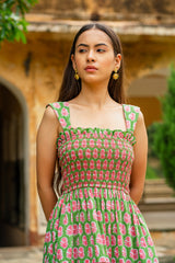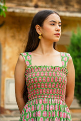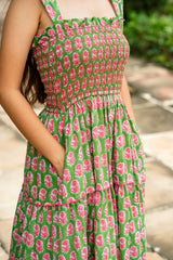 Our bestselling Maddie style is back, and she's the ultimate wardrobe staple. Featuring pink smocking on the bodice, pretty lace details and a full maxi skirt. Block-printed by hand and made from beautifully soft organic cotton. The perfect versatile piece that you will be living in for many summers to come.