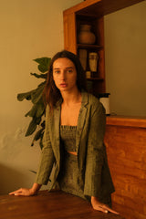 The muted olive hue, paired with the timeless checkered pattern, exudes a relaxed yet polished vibe, ideal for layering over neutral shades or pairing with bold accents. The floral details on the pockets and placket give it just the right amount of softness. Paired here with Olive Branch Skirt.