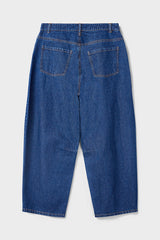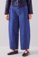 In mid-blue washed denim, these structured trousers feature a barrel silhouette shaped by darts at centre front hem and knee point darts, and a back yoke for a mid-waist tailored fit. Belt loops along waistband. Two symmetrical front pockets and two back patch pockets.