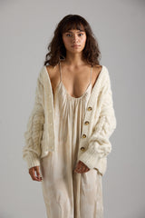 Paris is a timelessly elegant, cable stitch cardigan—crafted for comfort and elevated in design. Meticulously hand-knitted from the finest 100% Baby Alpaca yarn, it features a relaxed, oversized silhouette with classic front button detailing. Every stitch is a tribute to slow, intentional craftsmanship.
