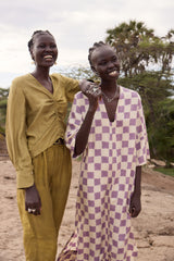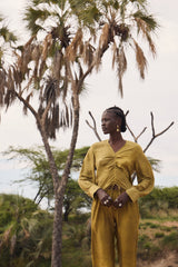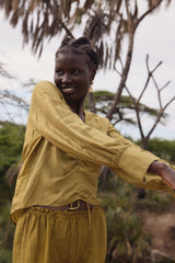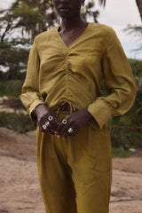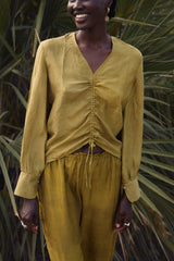 This seasons silk shirt in botanically dyed handloom silk features a front drawstring to style the shirt in a variety of ways with long sleeves and tulip shaped cuffs.