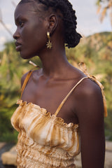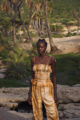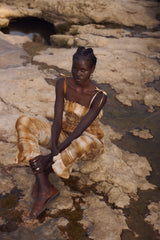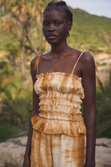 A rouched tube top with adjustable tie straps made from botanically shibori tie dyed hand loom silk. A summer staple favourite. Pair it with the matching frill hem bottoms to complete the look.