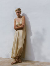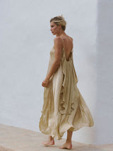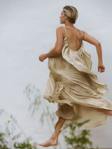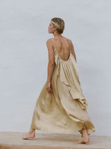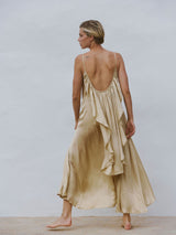 This style has been designed with ease and drama combined. Falling loosely to a floor-sweeping hem with ultra low back and graceful eye catching cascading back wing. The floaty 'Syros' has been hand dyed for the ultimate go to timeless statement dress.