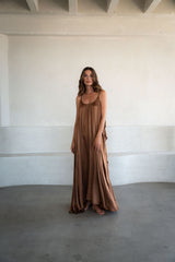 This style has been designed with ease and drama combined. Falling loosely to a floor-sweeping hem with ultra low back and graceful eye catching cascading back wing. The floaty 'Syros' has been hand dyed for the ultimate go to timeless statement dress.