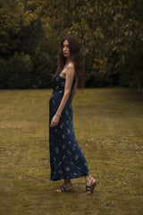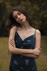 The Midnight Blue Silver Lining Slip Dress boasts a minimalist yet captivating design. Crafted from a rich midnight blue fabric, it resembles the tranquil night sky, evoking a sense of serenity and grace.