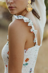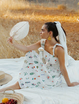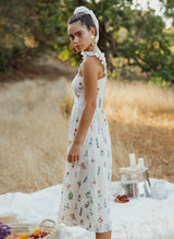 A fully embroidered fabric using the schiffly technique to punch holes to create patterns, and then printed with our Summer Herbs print.This picnic dress has very comfy frills for straps, the square neck of the dress makes it a very comfortable yet flattering fit. This midi length dress is a great pick when you're looking to be comfortable yet dressy all day.