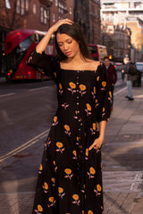 The Sunflower Button Dress is printed with mustard tone sunflowers on off-black cotton. It's buttoned down to the bottom. The shoulders can be pulled down or pulled up to style. The dress is calf-length and has a slight elastic at the back. A perfect dress for when you want a casual yet stylish look. This dress is with pockets, to carry some sunshine.