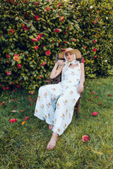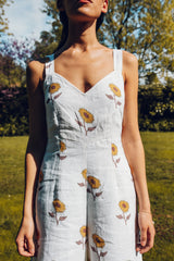 Sunflower jumpsuit is printed with the hand block technique. Each colour is transferred onto the fabric with a unique wooden block which is carved out by hand. This technique is native to the areas of Rajasthan, India where our workshop is based. The jumpsuit is made in linen, is wide legged and has wide shoulder straps, and is lined with cotton. It's an easy wear yet dressy item for a bright summer day.