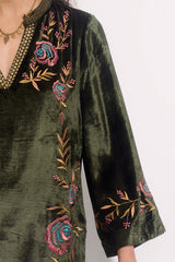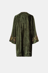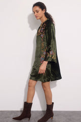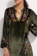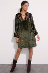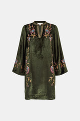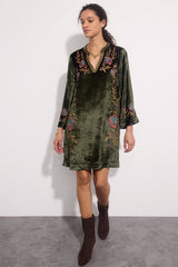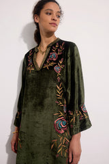 This dress features an enchanting floral embroidery in tones of teal, pink, and gold, beautifully accenting the olive-green fabric with a refined touch of color and texture. The relaxed fit and flowy silhouette make this dress as comfortable as it is stylish. Designed with flared sleeves, and a split neckline, adorned with delicate embellishments, the Talia dress offers a bohemian charm that’s perfect for any season.