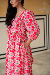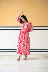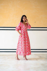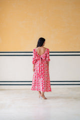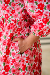 Block-printed by hand, in our vintage poppy print, the Lottie Dress is a beautiful and vibrant addition to your wardrobe. Featuring a flattering round neckline, a fun bow tie at the back, elasticated cuffs and pretty pin-tucks on the hem. Made from luxurious organic cotton, this dress is the perfect summer staple.