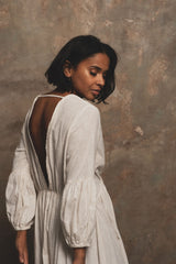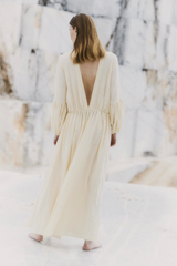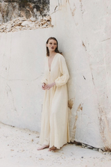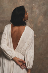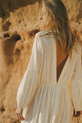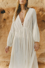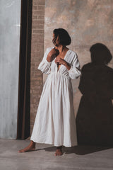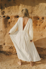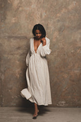 A beautiful maxi dress with billowing sleeves, crafted from organic cotton. The Wild Heart dress is a bohemian dream for sunny days and magical evenings with a flowing and bold silhouette. Front ties allow the plunging neckline to be closed slightly or remain open for a more dramatic appeal.