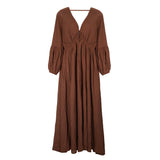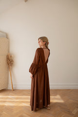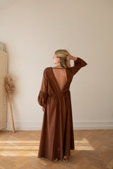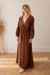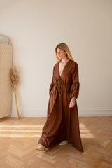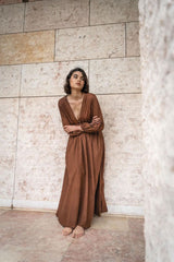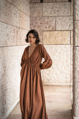 The classic Wild Heart, crafted from textured organic cotton. This dress is a dream with a flowing and bold silhouette. Front ties allow the plunging neckline to be closed slightly or remain open for a more dramatic appeal. A must have for an elegant and capsule summer wardrobe.
