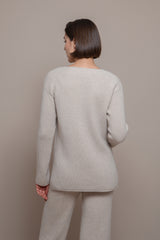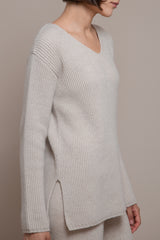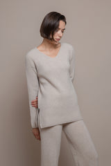 A classic ribbed knit jumper in a super soft wool and cashmere mix. The relaxed fit, v neck and slits to the side make this one an easy to wear knit that will go with most pieces in your wardrobe. It is light but warm and is great for slowing down at home our dressed up for when you are out an about. We especially love it worn with the Joan Trousers.