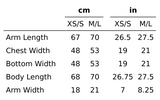 | Arm Length | 67 | 69 | 26.5 | 27.25 |