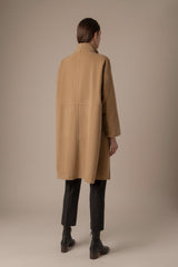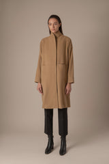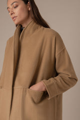 A true investment piece for your sustainable wardrobe. A long cashmere coat in camel with and high-collar for extra warmth around the neck area, and two front pockets. The Marcela coat has an oversized fit with an evase cut for a relaxed look, allowing you to wear it with chunky knits, like James jumper. A timeless, chic classic, this is a wonderful buy.