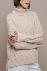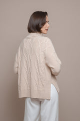A classic cable knit turtleneck to wrap up in on cooler days. Made from a luxurious cashmere and superfine wool mix, it is beautifully cosy and soft. The fit is slightly oversize for ultimate comfort and the cream colour will go with everything in your wardrobe.