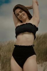 Our Rosalie Bikini Bottom is our classic shirred bottom with ruffle edge and pairs perfectly with our bandeau Rosalie Bikini Top.