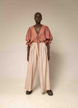 This seasons flowy bag pants feature a wide loose silhouette and exaggerated pleating along the waist. Drawstrings finish the waistline with two strings on either side of the waist allowing for a versatile pair of pants that can be worn high or low with a wide adjustable girth. Pair them with any of our tops this season to complete the look.