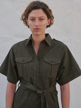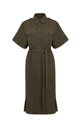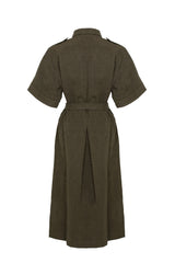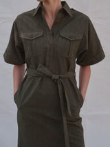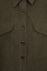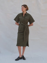 Fabric - The Kernal Shirtdress in Dark Olive Mikkusu is made of dense cotton (not sheer) and is dyed using the 'Damaged, Washed & Dyed' method which gives it a lived-in, aged look and exquisite texture. We work with textile artisans, who abide by the principle of seed to cloth using natural and traditional methods within their appellation. The fabric is grown and made from seed to fabric in Japan.