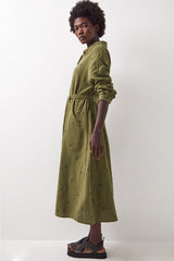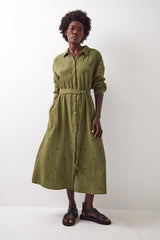 The Evaline Khaki dress crafted from cotton double gauze. Leaf embroidery all over the dress. Tie waist belt finished with tassels. Flattering midi length with button down placket. Two side pockets.