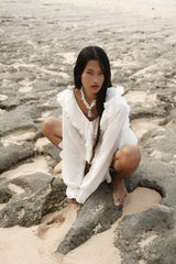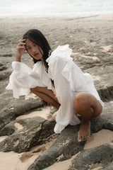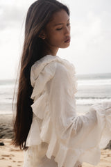 Our Stevie blouse is a relaxed ruffled bohemian blouse in lightweight organic cotton. Featuring a deep V neck, cascading ruffles and raw seams. Wear it day into night for laid back luxury and a bohemian edge across all seasons.