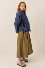 Crafted from lightly quilted denim in a mid-blue wash, this kimono-inspired piece combines structure with relaxed ease. Designed with a cross-over front and tie fastenings, it features wide sleeves and a soft shawl collar that create an effortless, layered silhouette. Fully lined in blue cotton stripe for added comfort and finish, it’s an easy statement layer for everyday dressing.