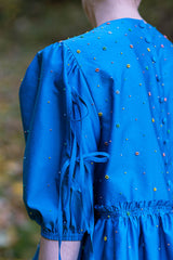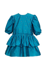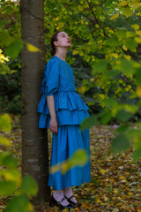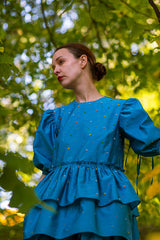 A turquoise colour Celine top expresses elegance and femininity. The expressive voluminous silhouette combines a voluminous bodice, layered tiered peplum, and dramatic puff sleeves. A bold colour is emphasized by hand embroidered beads and delicate buttons in the back.