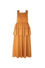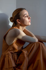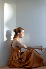 The feminine Bonnie dress is crafted from soft cotton sateen. The sculptural voluminous silhouette combines a square neck bodice and layered tiered skirt. Loose fit and gathered seams embody femininity while fabric structure and subtle brown shade creates a moving A-silhouette.