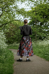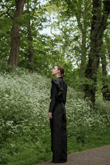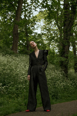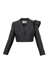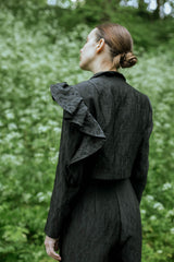 The Midnight jacket translates a conversation between elegance and sculptural minimalism. The feminine silhouette is defined by waist length bodice, classical collar, and sleeves. Sharp shoulders are highlighted by a unique beaded shoulder piece. The jacket's form and lines are emphasized by a rich jacquard texture and light-catching weaving pattern. Closure is fixed by a matching covered button.Details