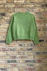 The Ada crewneck sweater in a fresh apple green. A lightweight knit in soft lambswool spun in a Donegal style with characteristic tweedy flecks of many colours including white and yellow, just like a Spring meadow.