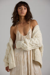 Paris is a timelessly elegant, cable stitch cardigan—crafted for comfort and elevated in design. Meticulously hand-knitted from the finest 100% Baby Alpaca yarn, it features a relaxed, oversized silhouette with classic front button detailing. Every stitch is a tribute to slow, intentional craftsmanship.