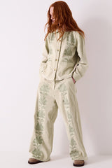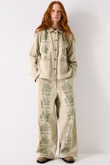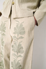 The Astrid Trousers - Wide-leg cotton corduroy trousers in sage-mist with vertical tonal embroidery. A clean, full-length cut. Side pockets. Wear with the Astrid jacket for a full set.