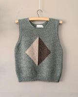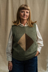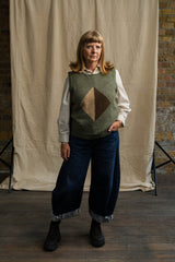 Our knitted Green Diamond Vest is knitted in dusty green with hints of oatmeal and oak brown. It's a relaxed style with dropped armholes, to give plenty of room when wearing with shirts and sleeved dresses. This woollen vest is the perfect piece for layering and adding extra warmth during transitional seasons, British holidays, picnic outings, camping trips and cool Summer evenings.