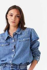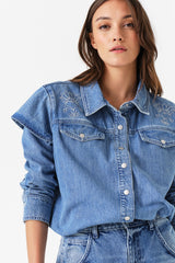 A western style embroidered denim shirt, with a tailored, button-down fit.